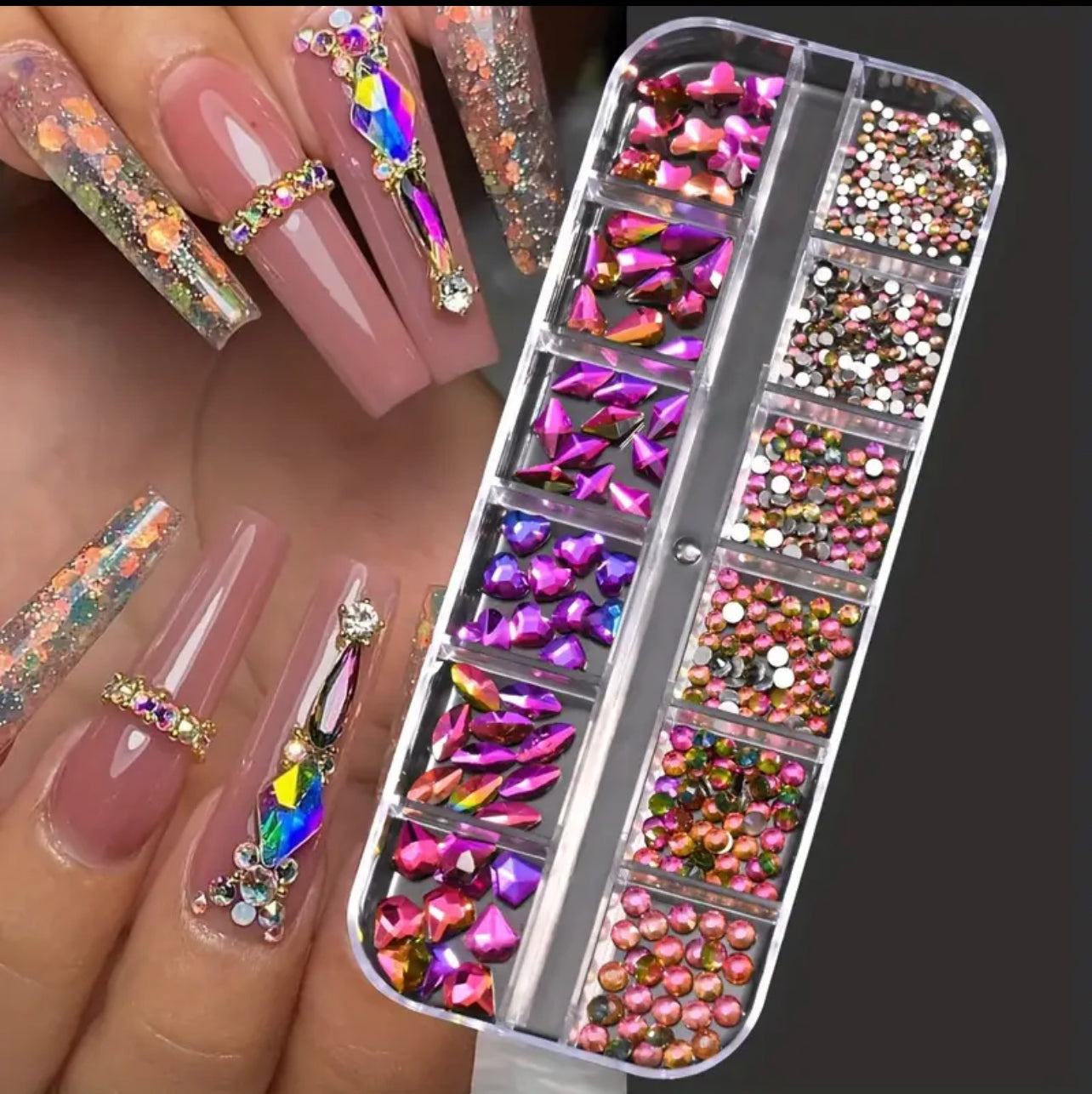 1000+ Pieces 12-Grid Nail Art Rhinestone Set - Vibrant 3D glass pink an