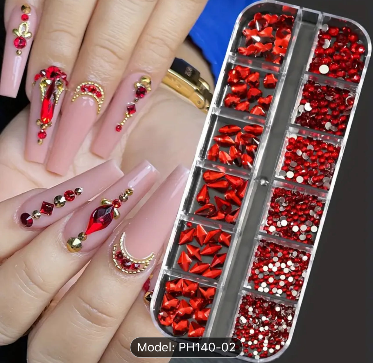 1000+ Pieces 12-Grid Nail Art Rhinestone Set - Vibrant 3D glass red color