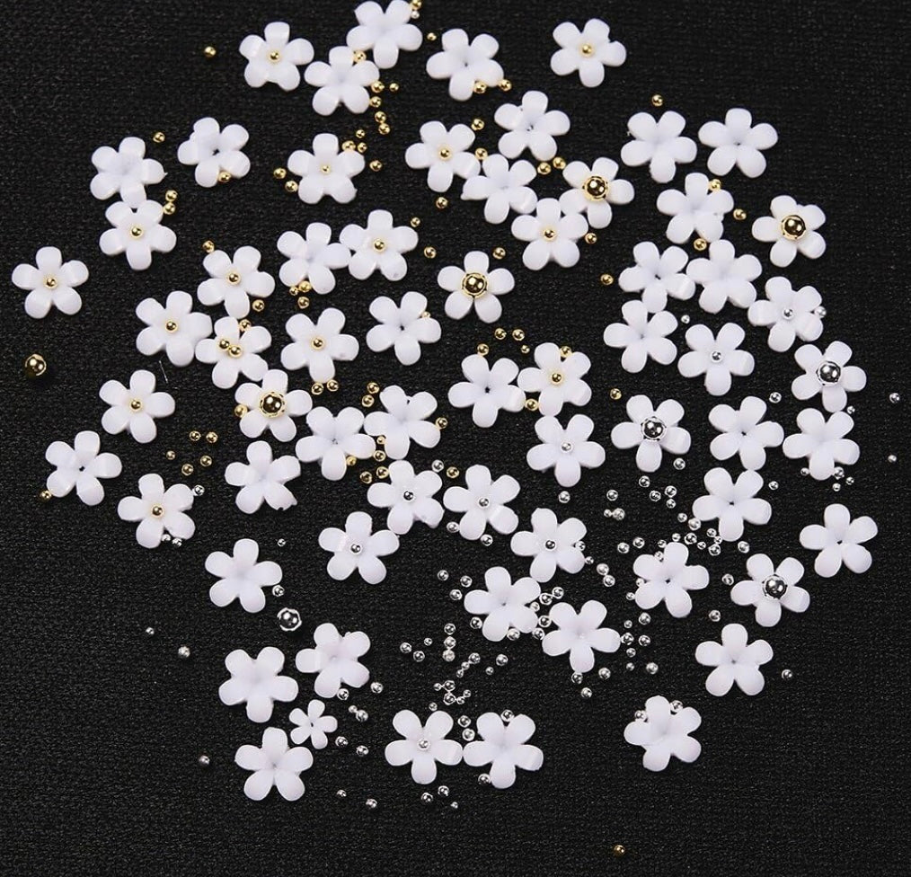 Bolt bee 6 Grid Flowers Acrylic Nails 3D Floral Nail Charms Glitter White Flower with Gold Silver Nail Ball Beads and Beads Resin Flowers for Nail Art Decoration & DIY Crafting Design