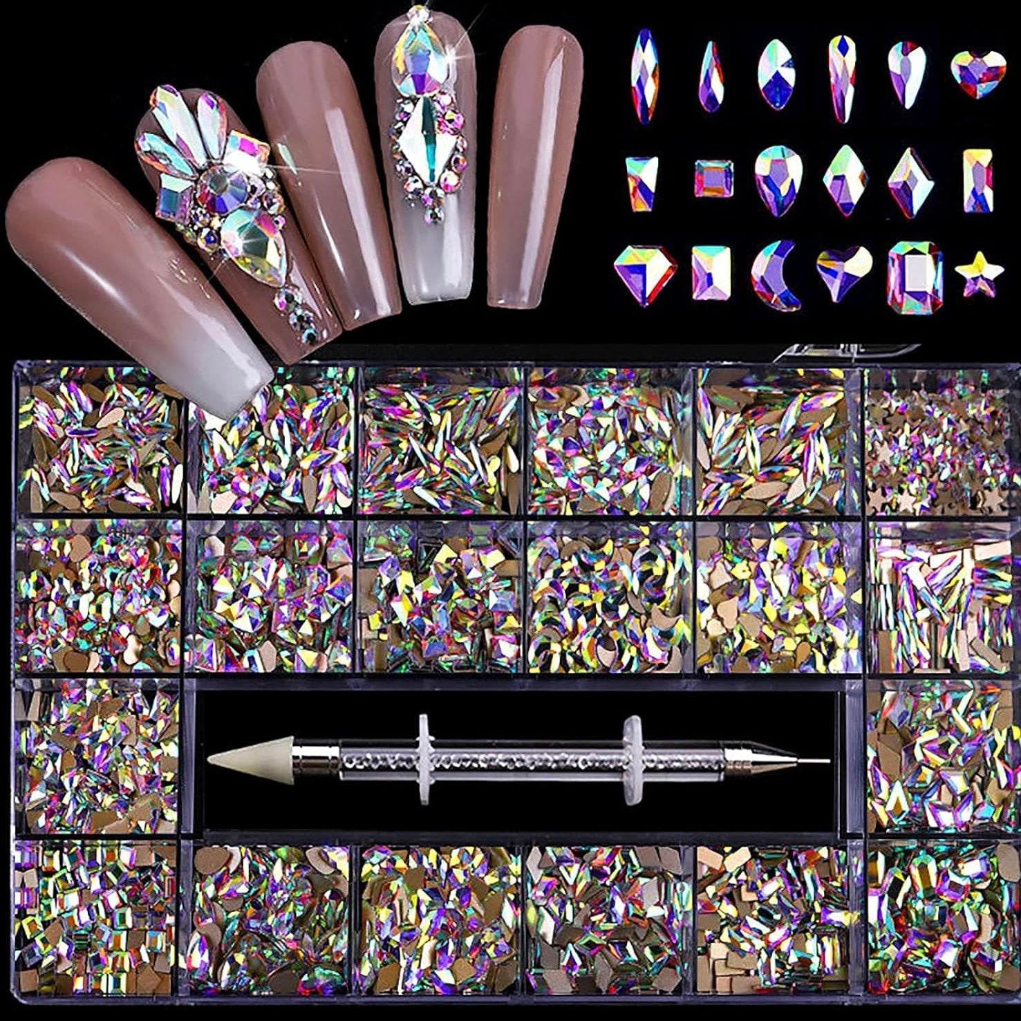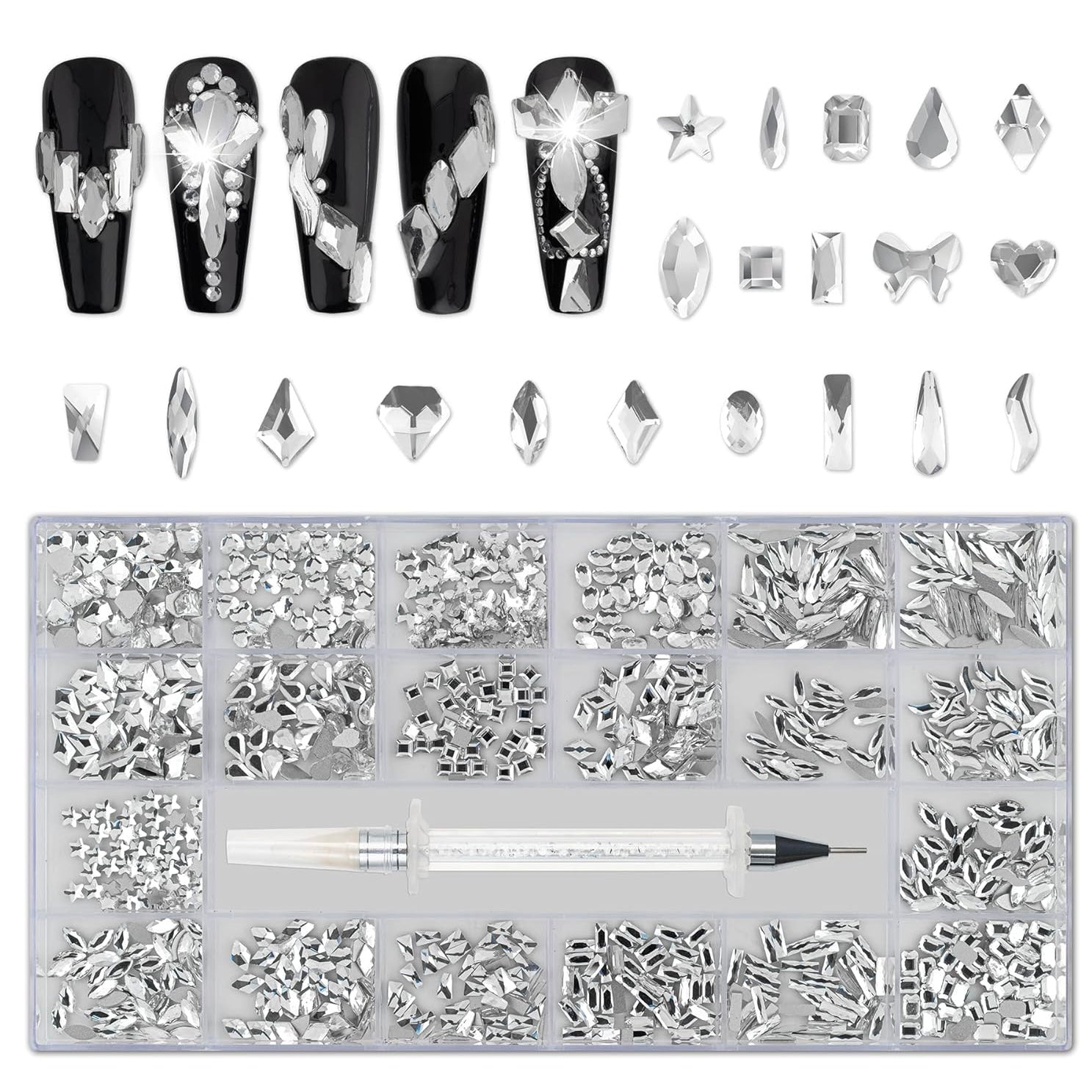 Nail Gems and Rhinestones Kit with Wax Pencil 1000 Pcs Flatback Rhinestones for Nails Decorations, Crafts, Makeup, Face, Clothes, Shoes