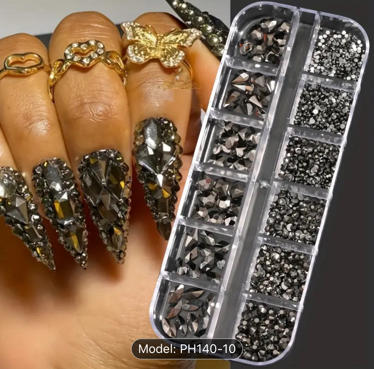1000+ Pieces 12-Grid Nail Art Rhinestone Set - Vibrant 3D glass SHine black color