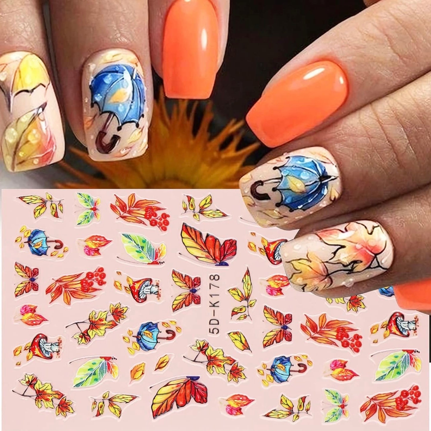 5D Fall Nail Stickers, Maple Leaves Nail Decals Embossed Autumn Nail Art Supplies Pumpkin Butterfly Rose Maple Leaf Nail Design Self Adhesive Nail Accessories Thanksgiving Day Nail Decoration (5D-K178)