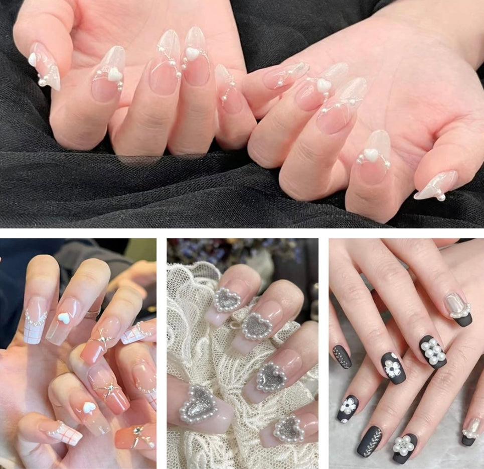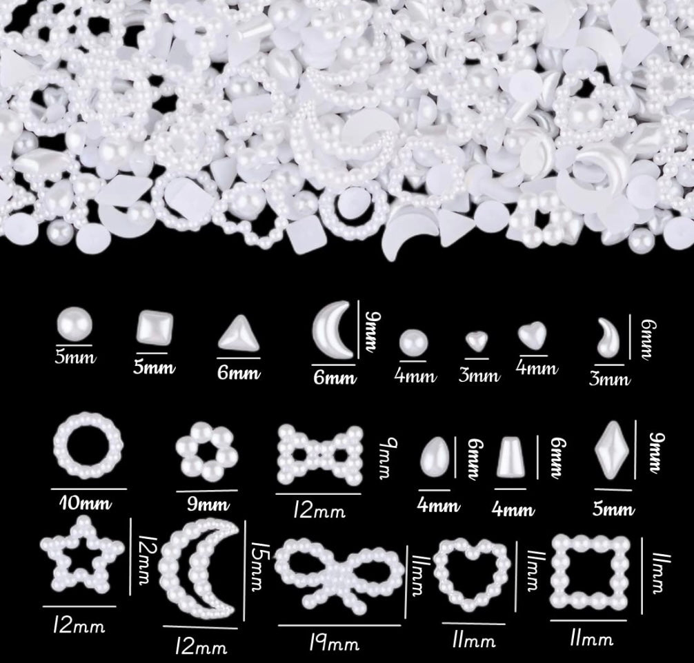 500Pcs White Half Pearls Heart Nail Beads Mixed Styles 3D Flatback Hollow Pearls Heart Star Moon Multi Shapes Rectangle Nail Charms (Muiti Shapes)