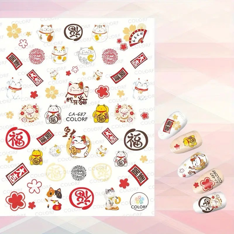 Chinese Style Nail Art Stickers With Lantern Lucky Cat Design, Self Adhesive Nail Art Decals For Nail Art Decoration, Nail Art Supplies For Women(CA-687)