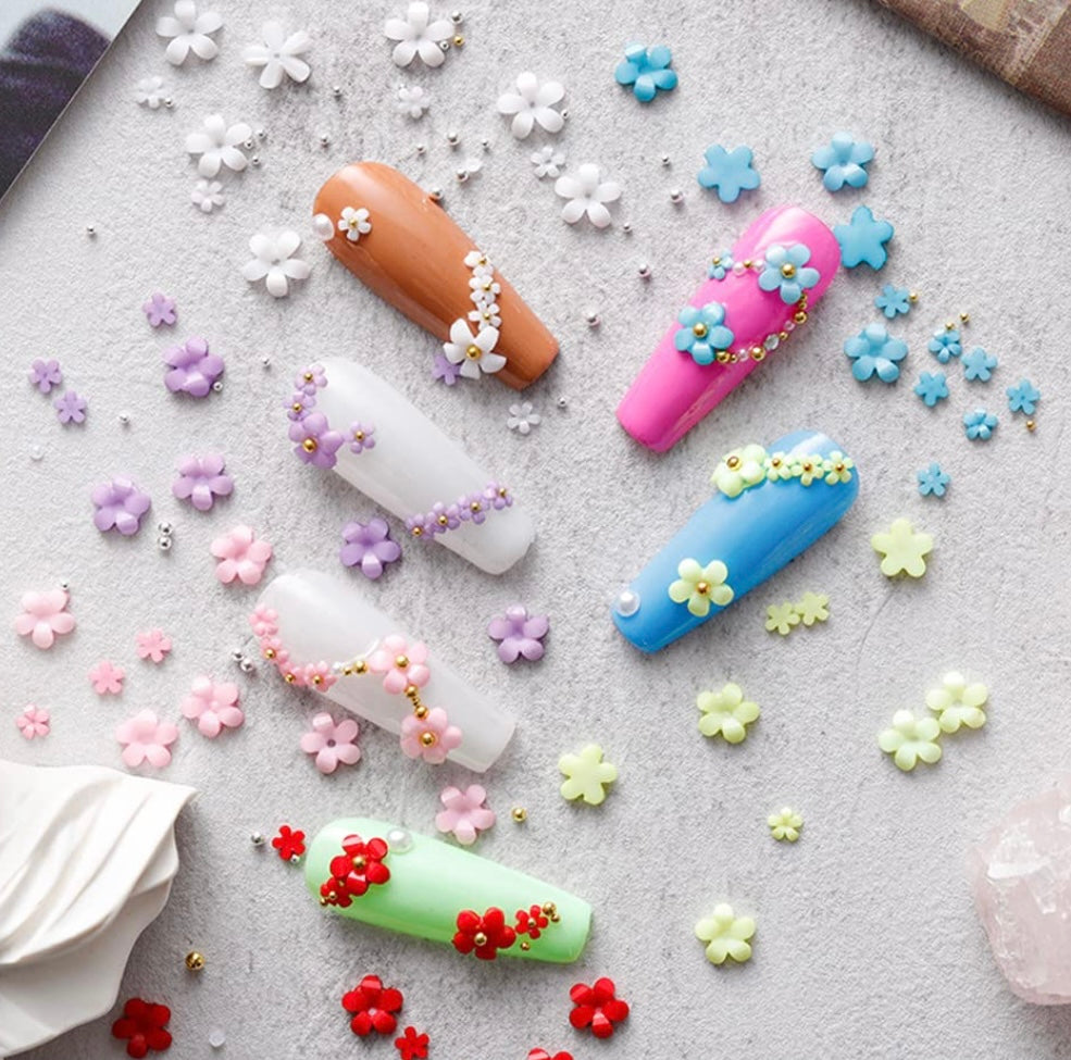 Flower Nail Charms 3D Flowers and Metal Caviar Beads Nail Art Decoration Five Petal Flower Pearl Acrylic Nail Art Stud Accessories for Women Girls DIY Manicures Crafting Decoration