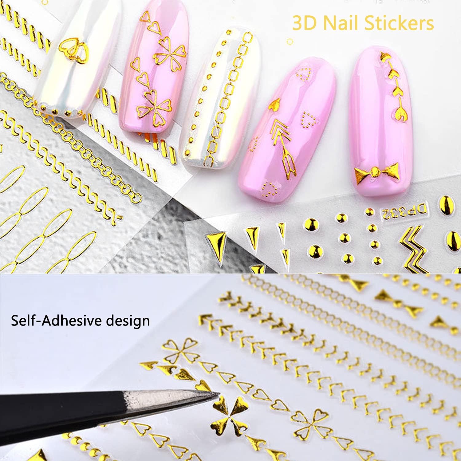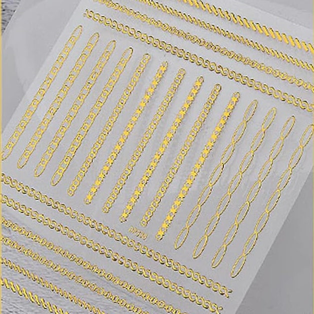 Gold Chains Nail Art Adhesive Stickers, 3D Metallic Chains Line Triangle Heart Circle Shape Nail Decoration, Holographic Glitter for Women Manicure Tips(DP-338)