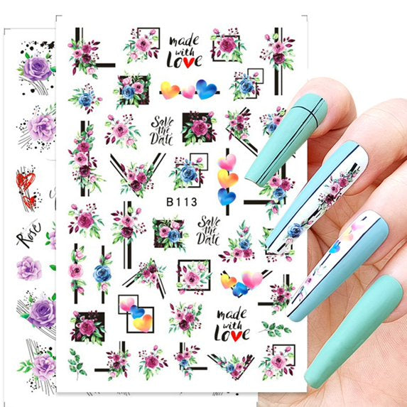 Nails Flower Stickers Decals Blue & Purple Roses and Hearts(B-113)