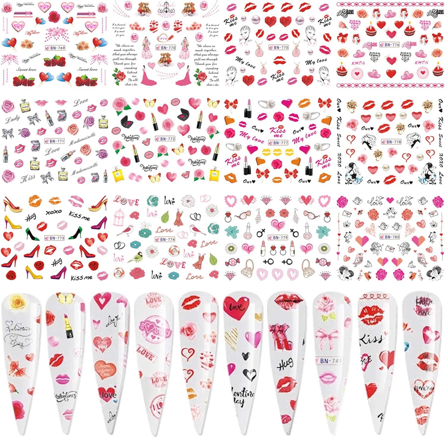 Valentine Nail Art Stickers Water Transfer Nail Decals Sexy Lips Love Lipstick Heart Rose Design Nail Sticker Manicure Tips Accessories Romantic Valentine's Day Nail Art Decorations (12 Sheets)